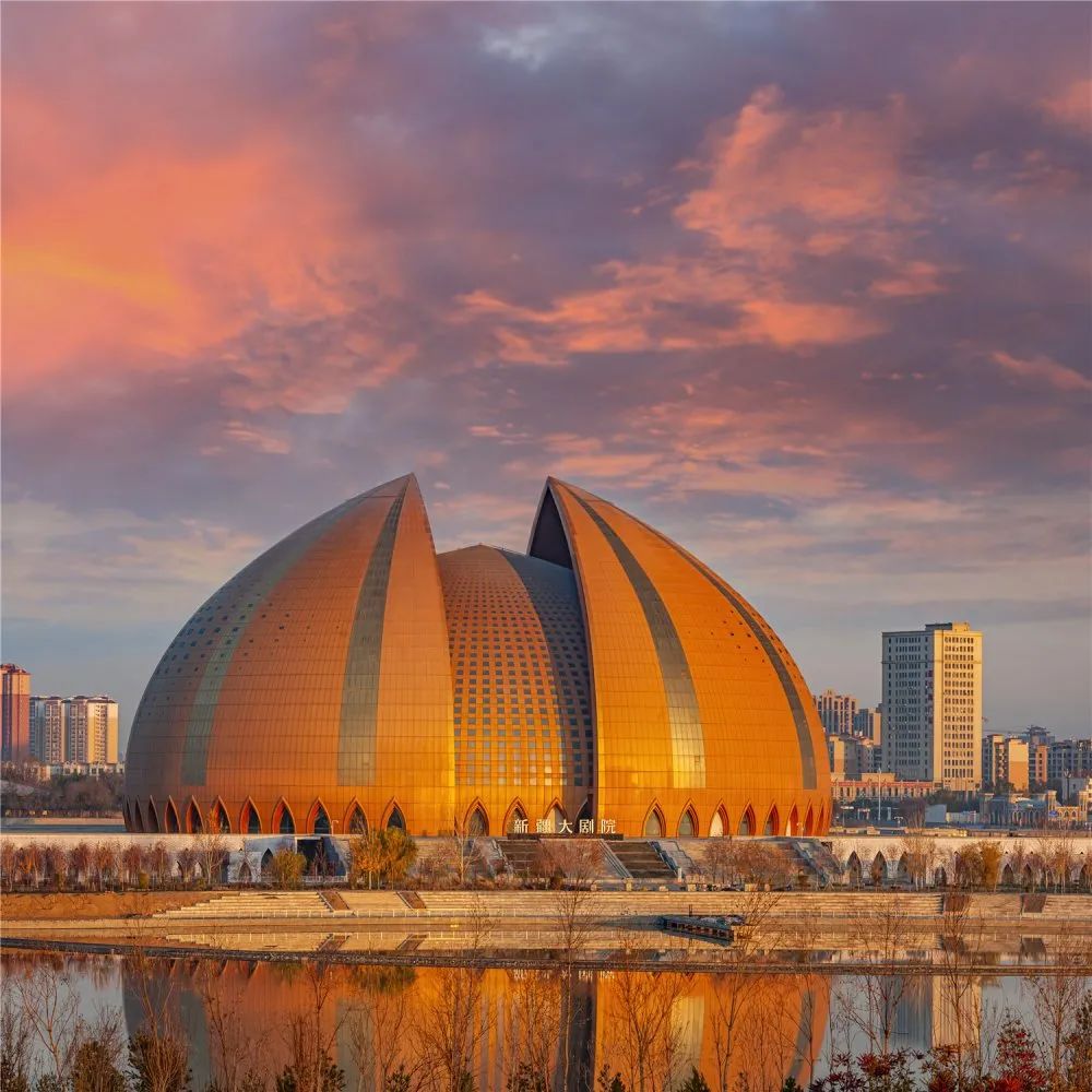 座落于昌吉的新疆大劇院,是中國目前最具民族文化特征的標(biāo)志性建筑,也是印象西域國際文化旅游產(chǎn)業(yè)園的核心建筑。主體坐落在平緩的臺(tái)基上,以盛開的天山雪蓮為原型,通過抽象與創(chuàng)新的設(shè)計(jì)手法,形成里外套層的穹頂造型主體形象。